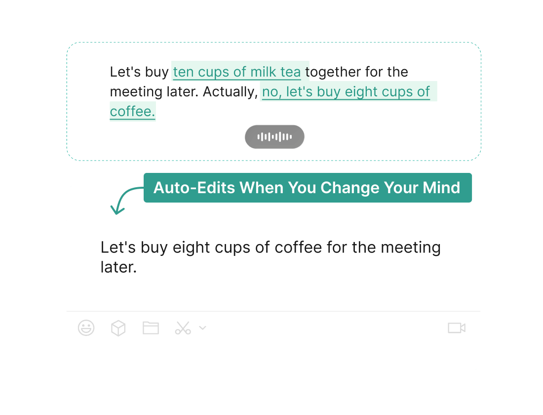 SaySo recognizes when you correct yourself mid-sentence and preserves only your final intended message, eliminating clutter and confusion.